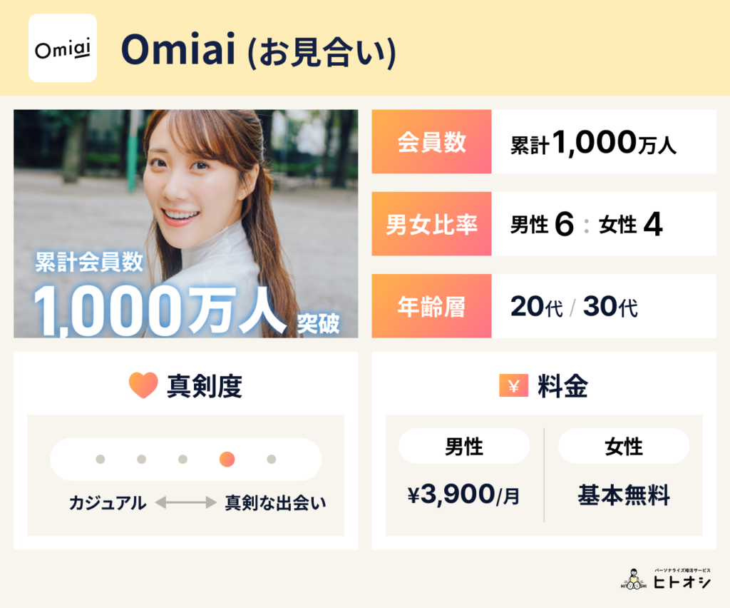 | Omiai | 20代後半~30代が中心。真剣な婚活を目的としたユーザーが多く、安全性にも定評がある |