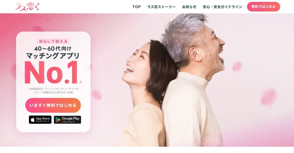 「若い人向けのアプリは、ちょっと使いづらい…」と感じている方に最適なのが、40代以上専門のマッチングアプリ「ラス恋」です。