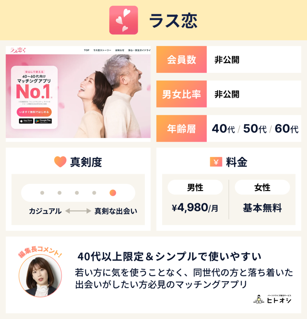 ラス恋![]() ![]() | 詳細を見る▶︎ | 4,980円〜/月 | 無料 | ☆☆☆☆☆ | 結婚 | 非公開 | 非公開 | 40~60代 | 任意提出 | 対応なし | 〇 | ✕ |