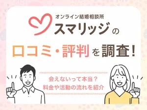 | 11 | ![]() スマリッジ | 業界最安の水準 格安で始めれる 公式サイト | コネクトシップ | ハイブリッド | 16,800円 | 9,900円 | なし | 約3万人 | 20代~30代後半 | 5.5:4.5 | ・20〜65歳未満の独身者 ・男性は定職・安定収入 ・各種証明書の提出が必要 | × | ・プロフィール作成サポート ・婚活プランニング面談 ・3か月ごとのフィードバックシート ・提携スタジオでの写真撮影支援 | ◯ | 最大6名/月 | 結婚の意思を確認・または意思を明確にした段階 | |